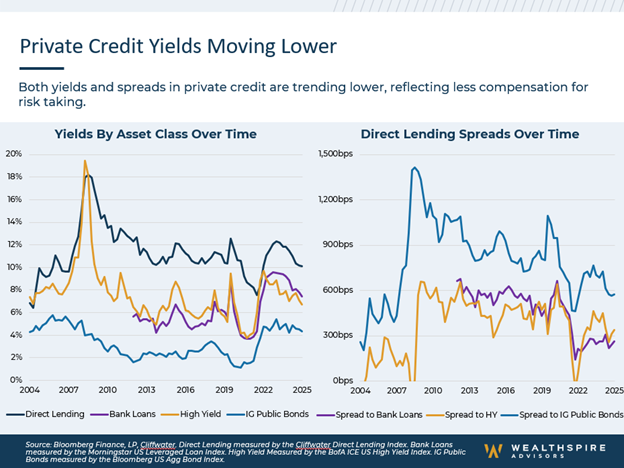 We saw evidence of spread tightening in corporate lending over the past couple of years, and the compensation investors receive for risk-taking continues to decline. The charts below illustrate the downward shift in yields and spreads. As the absolute level of income shifted lower, so did the excess yield that private credit offered in comparison to public fixed income.